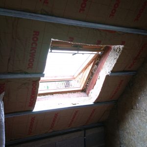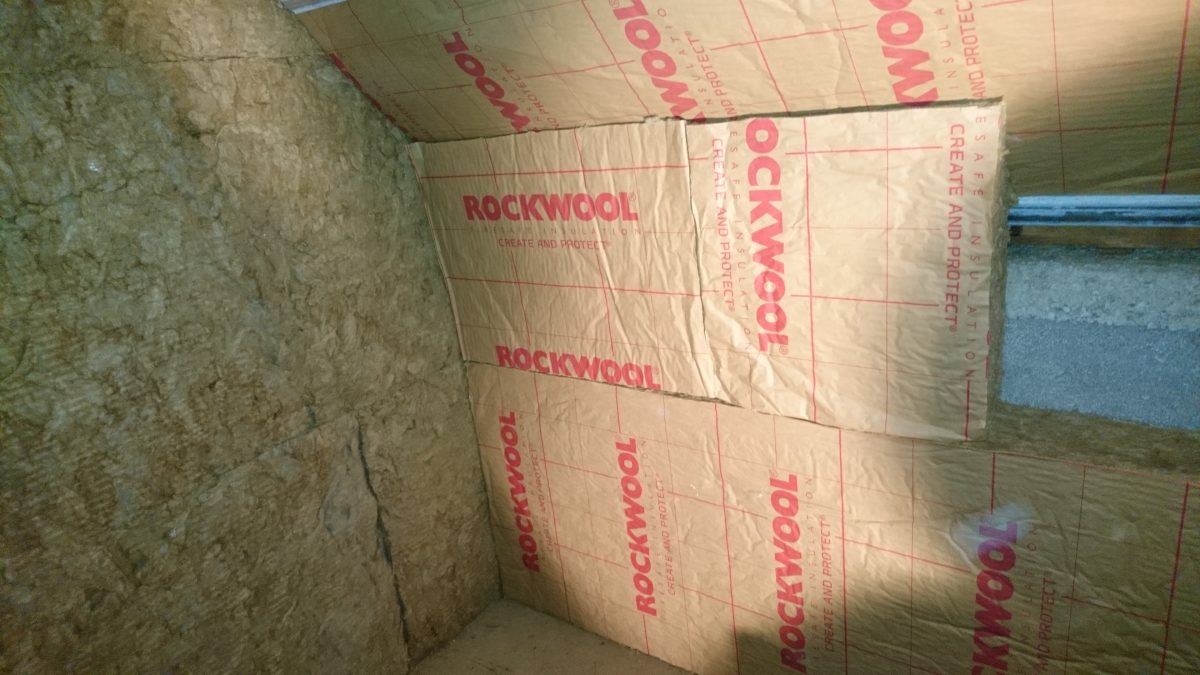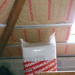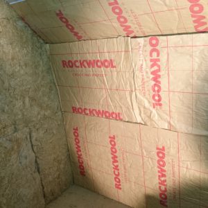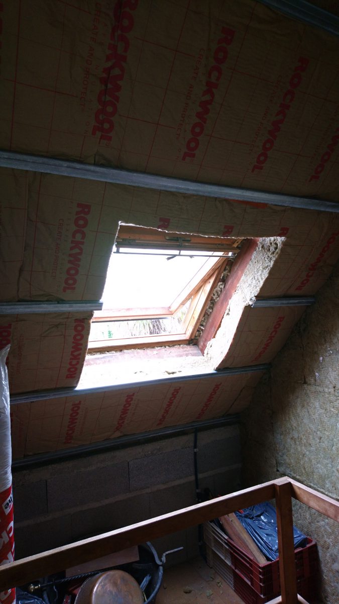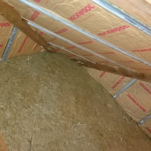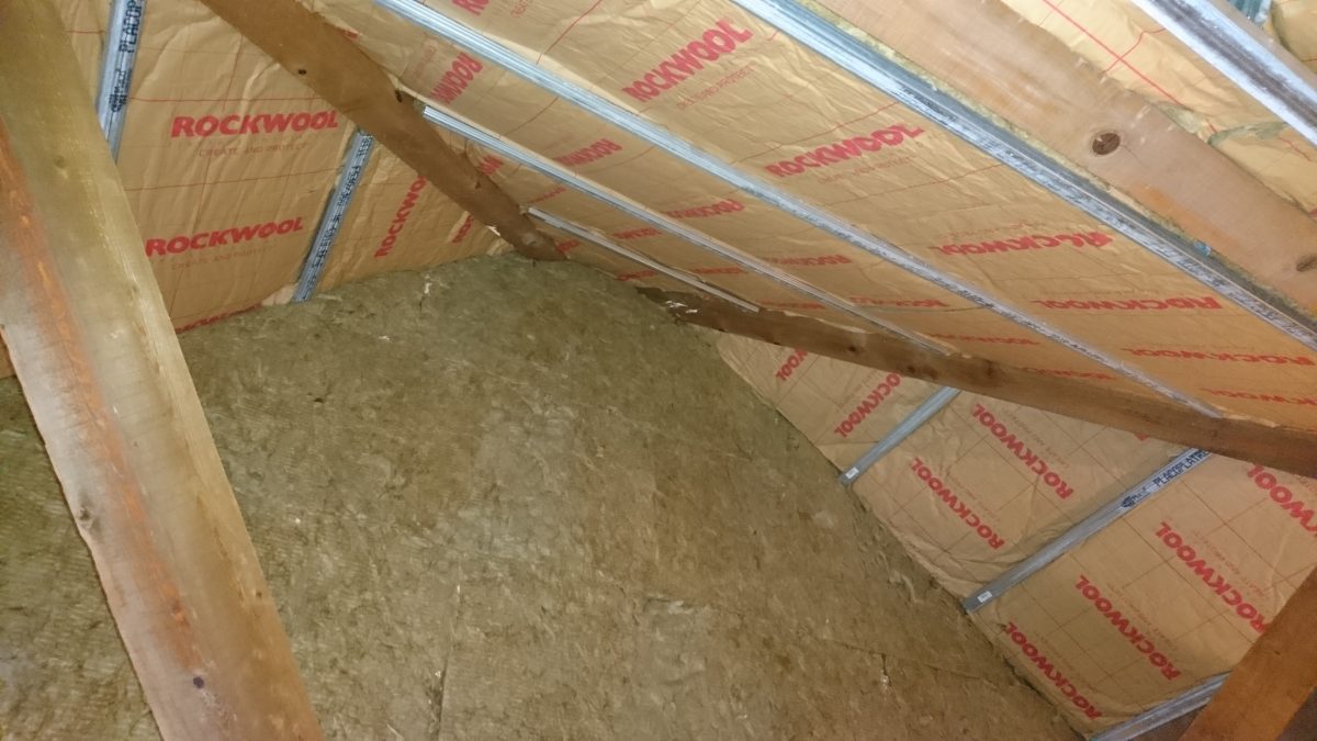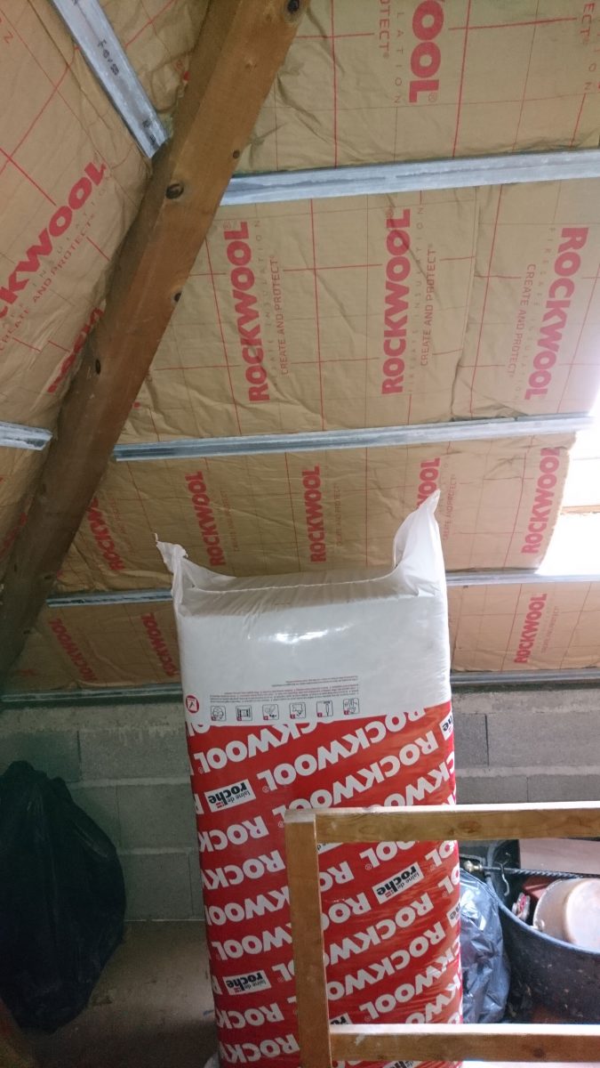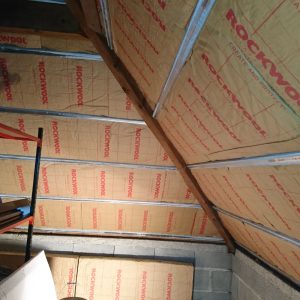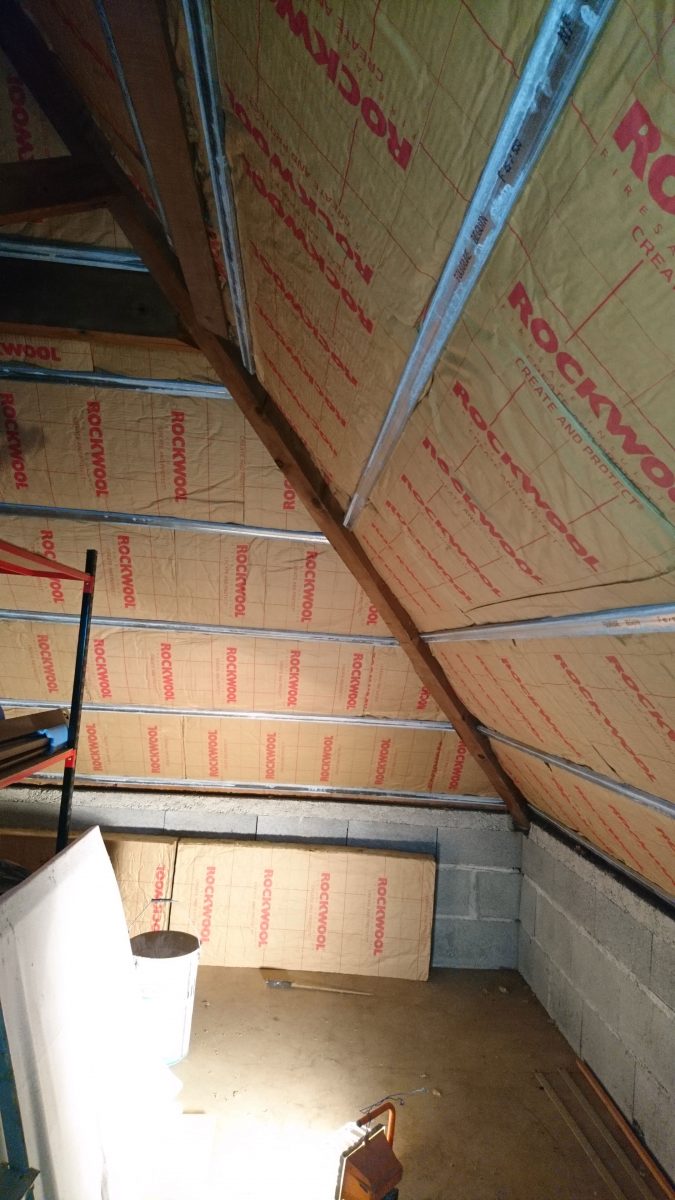 Mise en place de panneaux isolants en laine de roche. Ces panneaux sont tenus par des rails posés à cet effet. Les plaques de placo-platre pourront être installées par la suite.