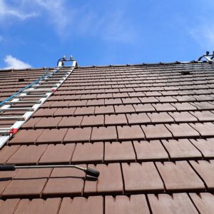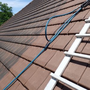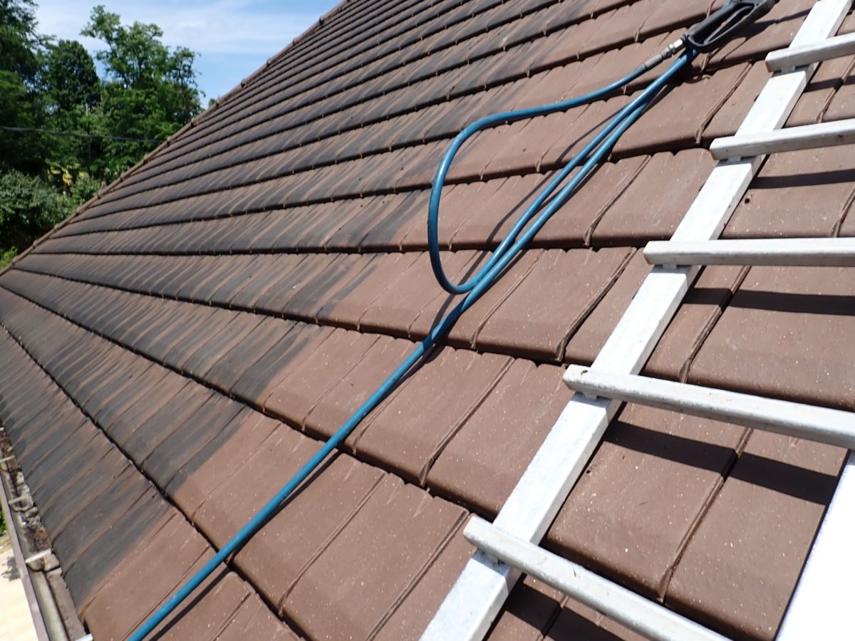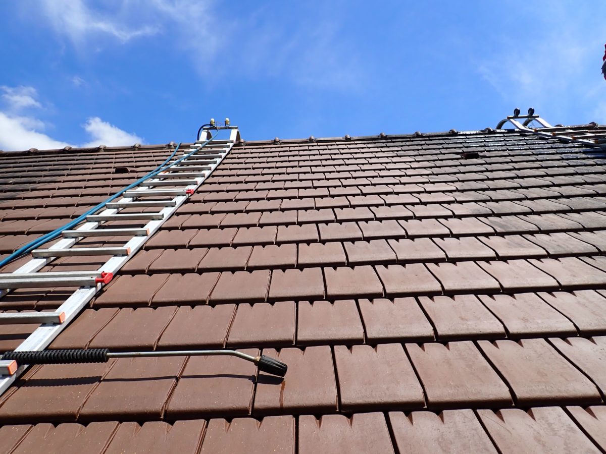 Les travaux consistent à démousser les tuiles et ensuite à poser un hydrofuge incolore qui permet d’améliorer l’efficacité et la pérennité du nettoyage de la toiture.