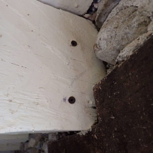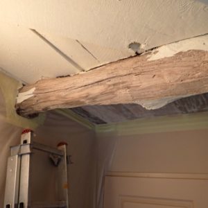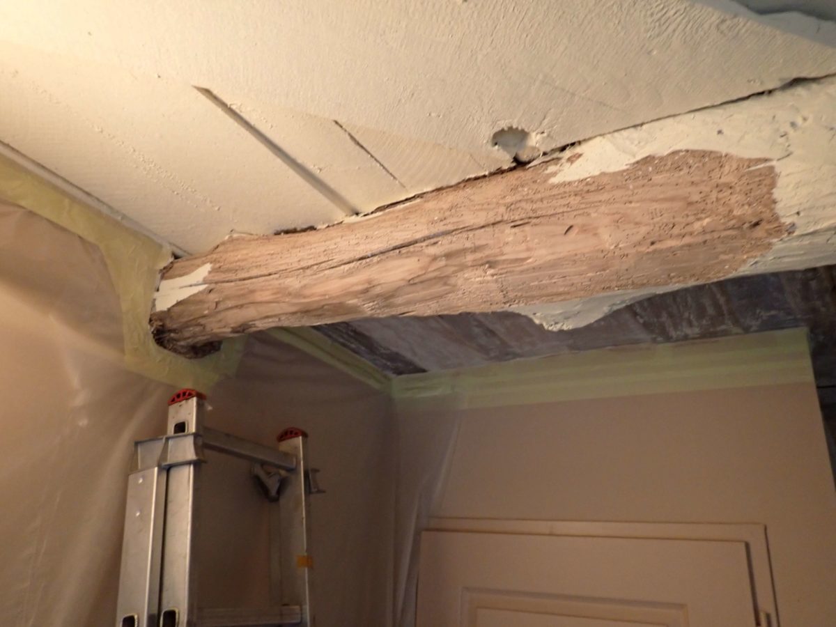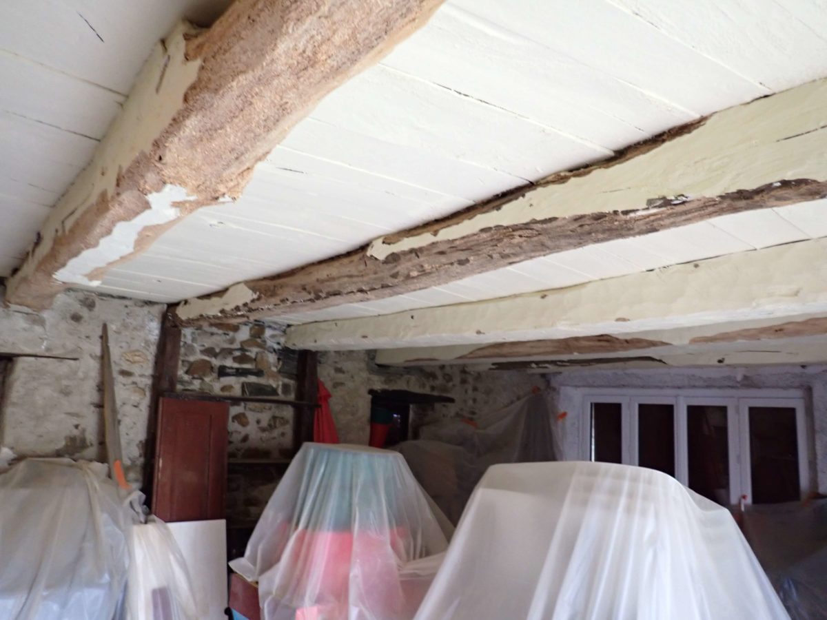 Après bûchage des parties endommagées, les bois de charpente sont percés pour y injecter le produit actif contre les xylophages.