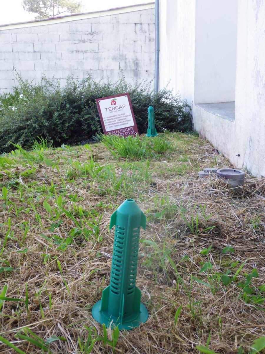 A Baigt-de-Béarn, TERCAP est intervenue dans une maison pour lutter contre les termites. Les techniciens spécialisés ont posé des pièges anti-termites dans le sol du jardin en périphérie de la construction. Dans la maison, les pièges contenant la molécule active ont été installés le long des pièces de bois déjà endommagées par les termites.